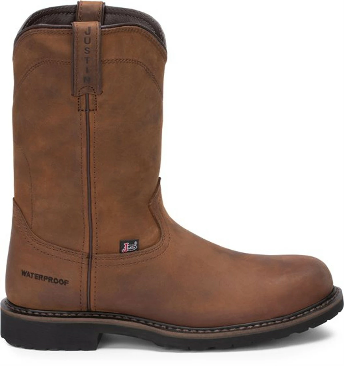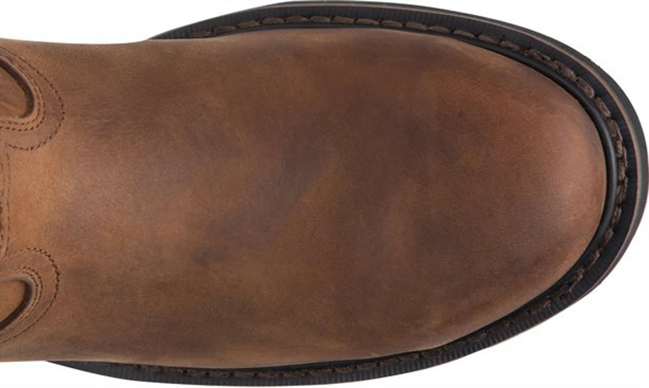 The Drywall Pull On Steel Toe is a 10″ tall Men’s pull-on work boot with a distressed beige waterproof leather exterior.