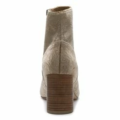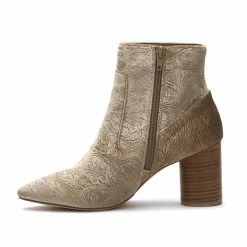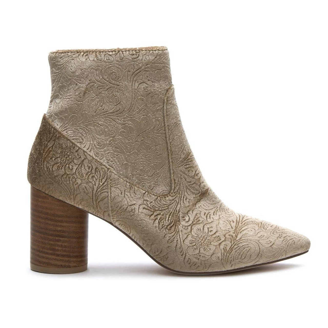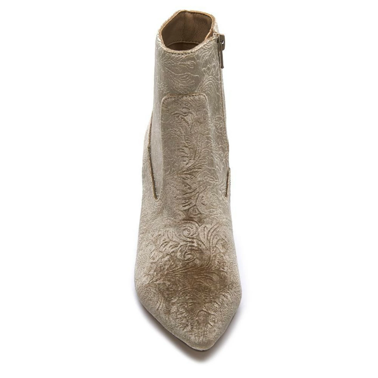 Basic ankle boot with cylindrical heel and tooled velvet upper.