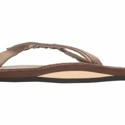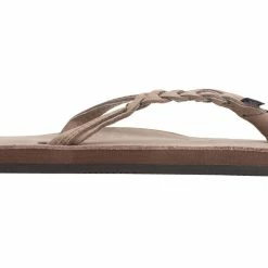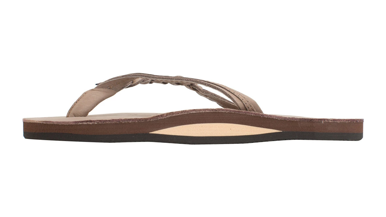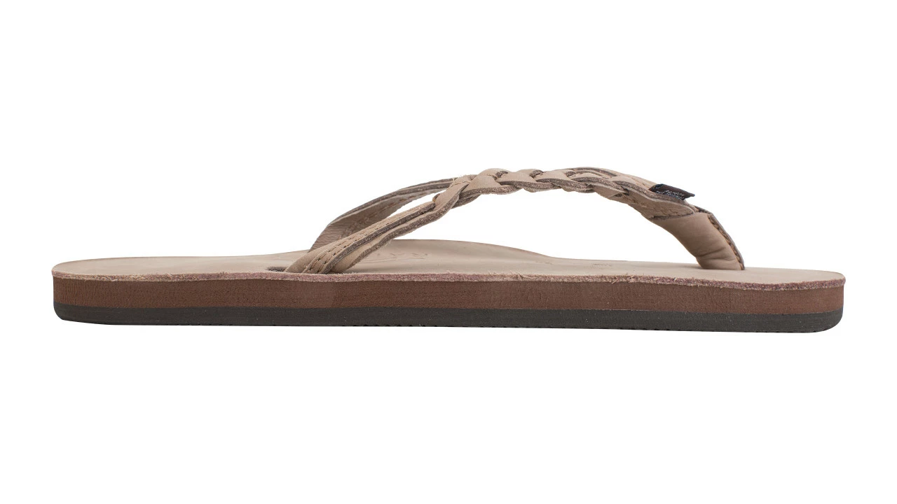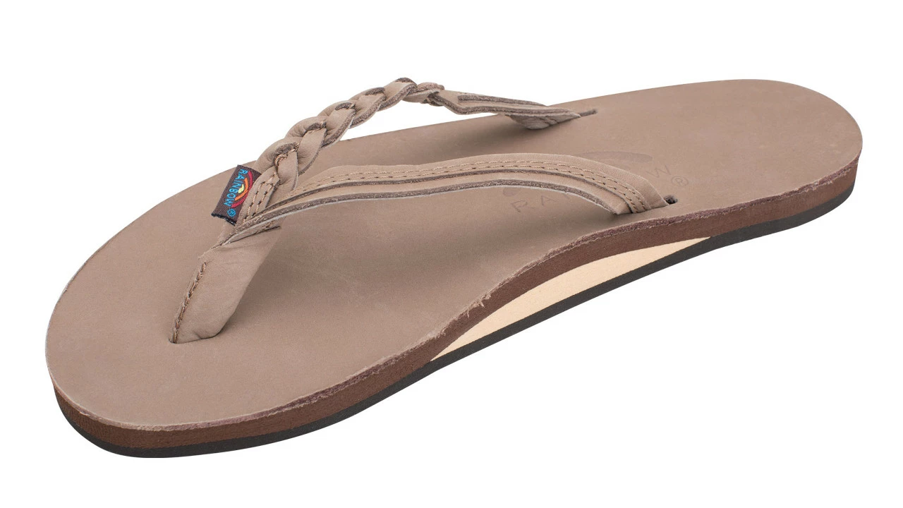 The 1/2″ narrow strap has an asymmetrical design featuring a braid on the outside straps and top stitched leather trim on the inside straps. The toe piece is our V style construction and is wrapped with soft leather for comfort. The right sandal proudly displays the Original Rainbowยฎ woven label.