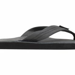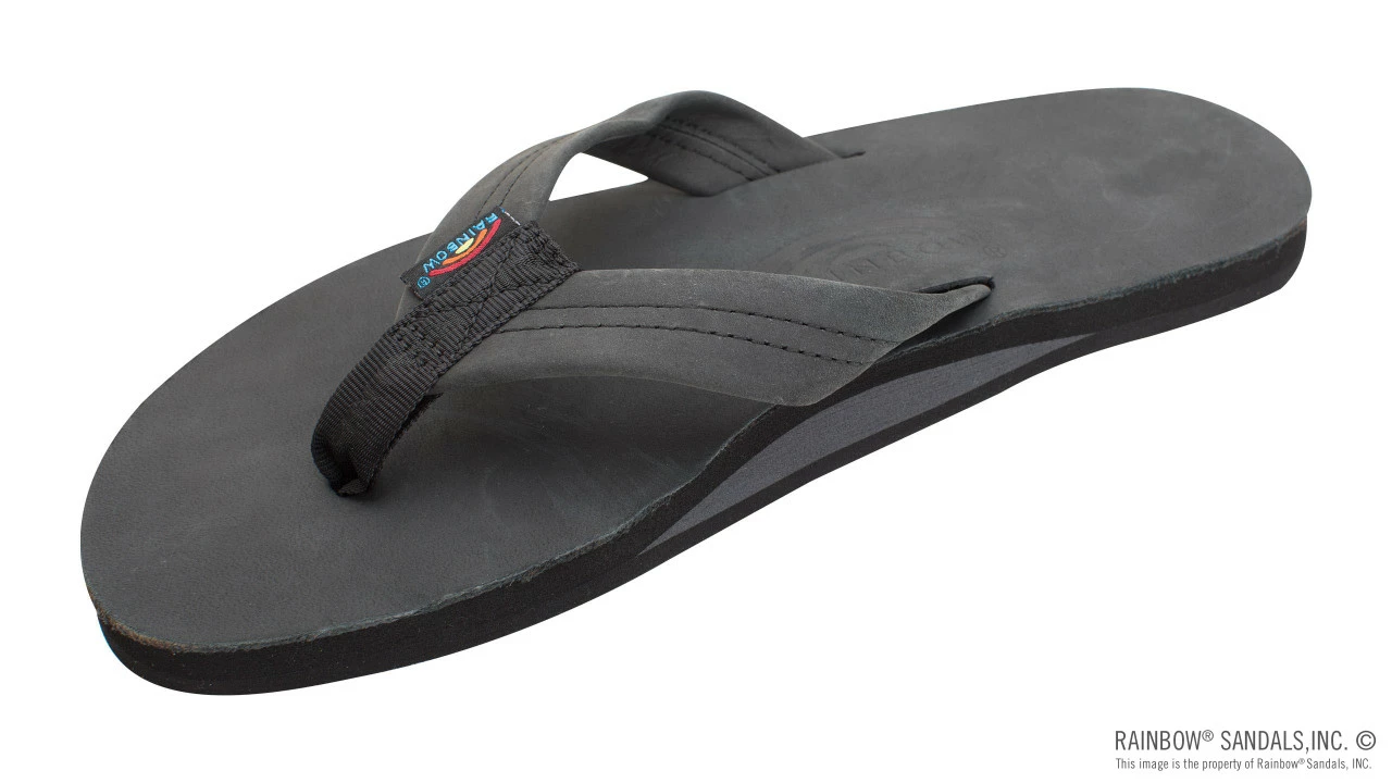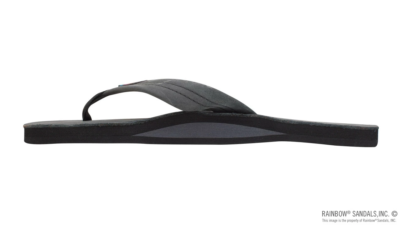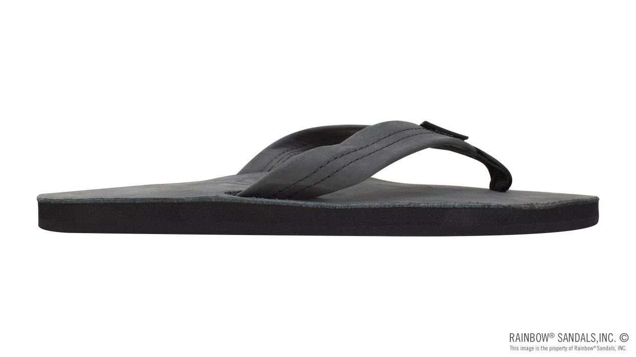 The single layer premier leather sandal is made with top grade nubuck leather; the top sole is embossed with the Rainbowยฎ logo. The strap, also nubuck leather; is double stitched, and the nylon toe piece is secured with a box X stitch, all using bonded nylon thread.