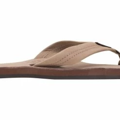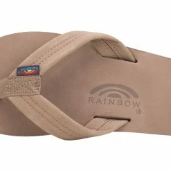 The single layer premier leather sandal is made with top grade nubuck leather; the top sole is embossed with the Rainbow® logo. The strap, also nubuck leather; is double stitched, and the nylon toe piece is secured with a box X stitch, all using bonded nylon thread.