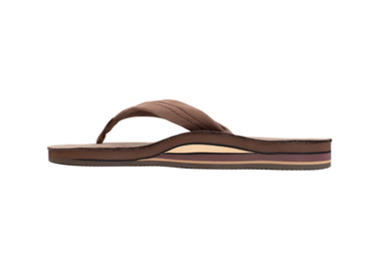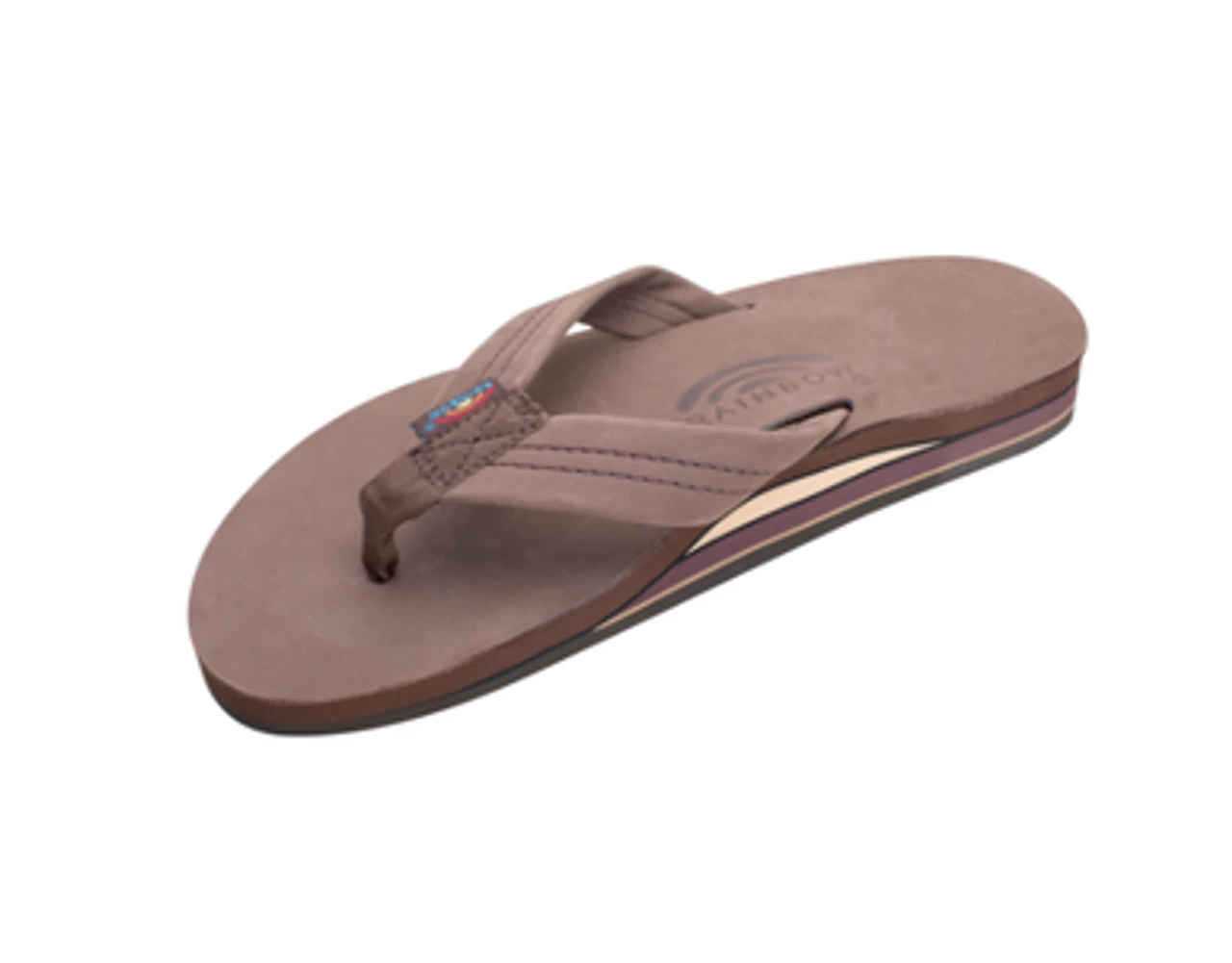 The single layer premier leather sandal is made with top grade nubuck leather; the top sole is embossed with the Rainbow logo. The strap, also nubuck leather; is double stitched, and the nylon toe piece is secured with a box X stitch, all using bonded nylon thread.