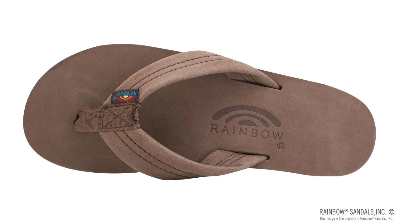 The top sole is premier nubuck leather, and is embossed with the Rainbowยฎ logo. The 1″ premier leather strap is double stitched, and the nylon toe piece is secured with a box X stitch, all sewn with bonded nylon thread.