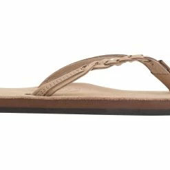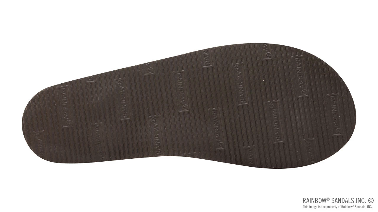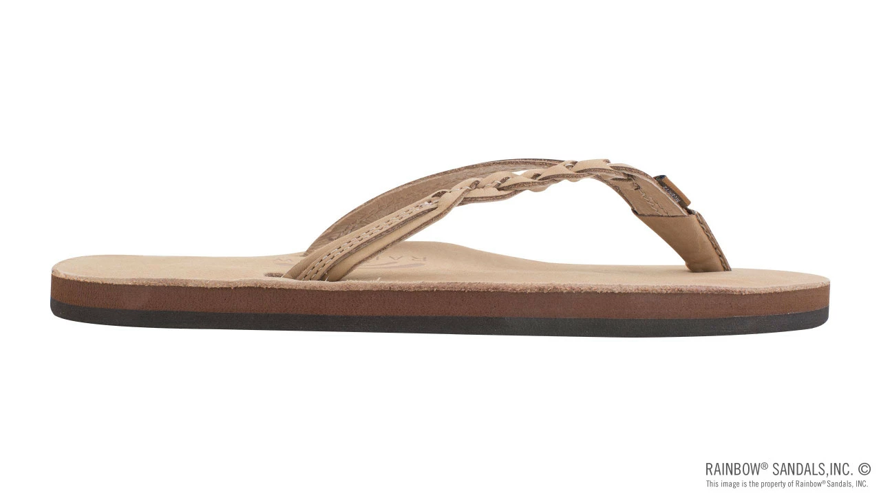 The 1/2″ narrow strap has an asymmetrical design featuring a braid on the outside straps and top stitched leather trim on the inside straps. The toe piece is our V style construction and is wrapped with soft leather for comfort. The right sandal proudly displays the Original Rainbowยฎ woven label.