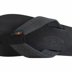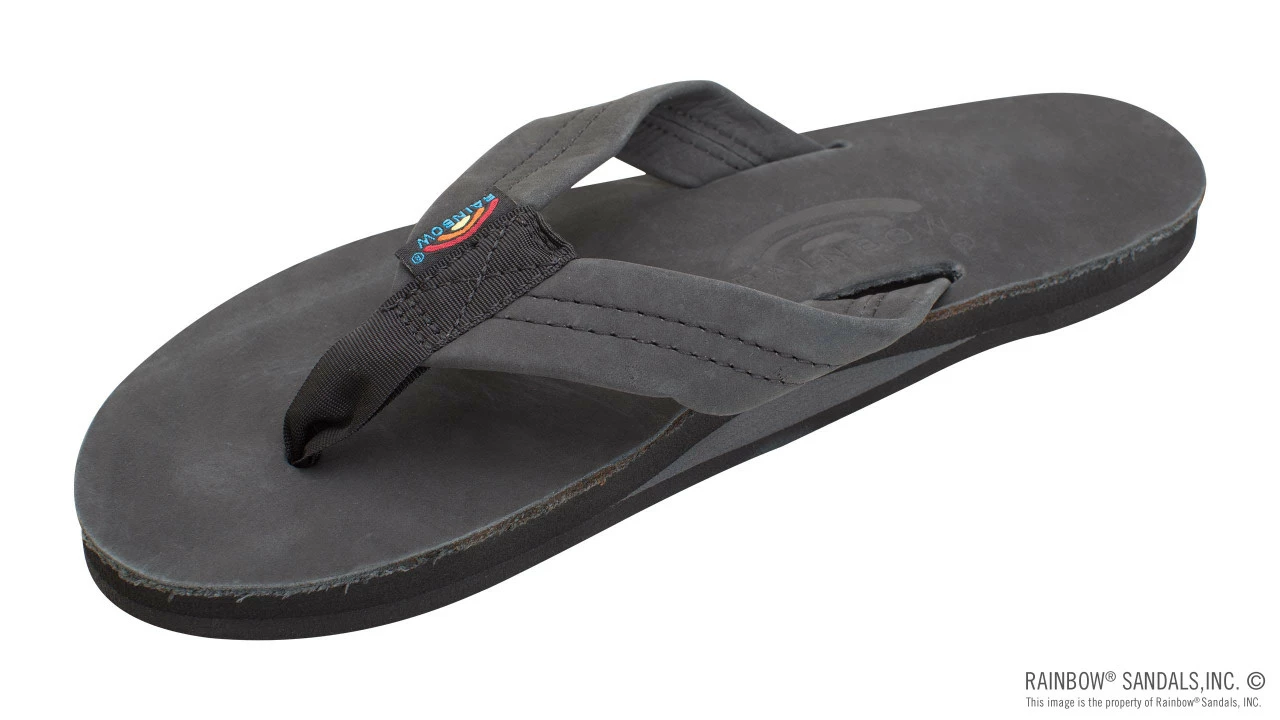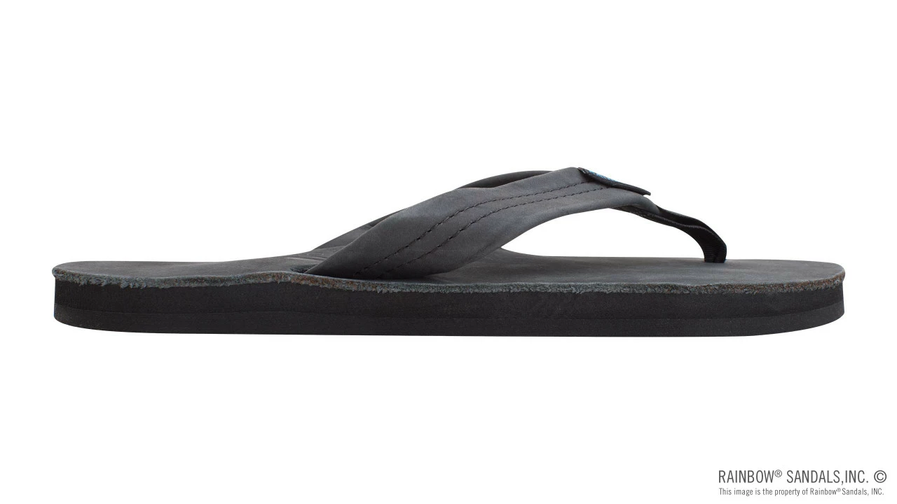 The single layer premier leather sandal is made with top grade nubuck leather; the top sole is embossed with the Rainbowยฎ logo. The 1″ strap, also nubuck leather; is double stitched, and the nylon toe piece is secured with a box X stitch, all using bonded nylon thread.