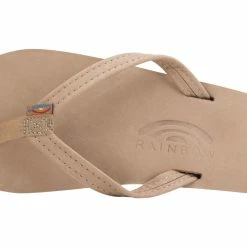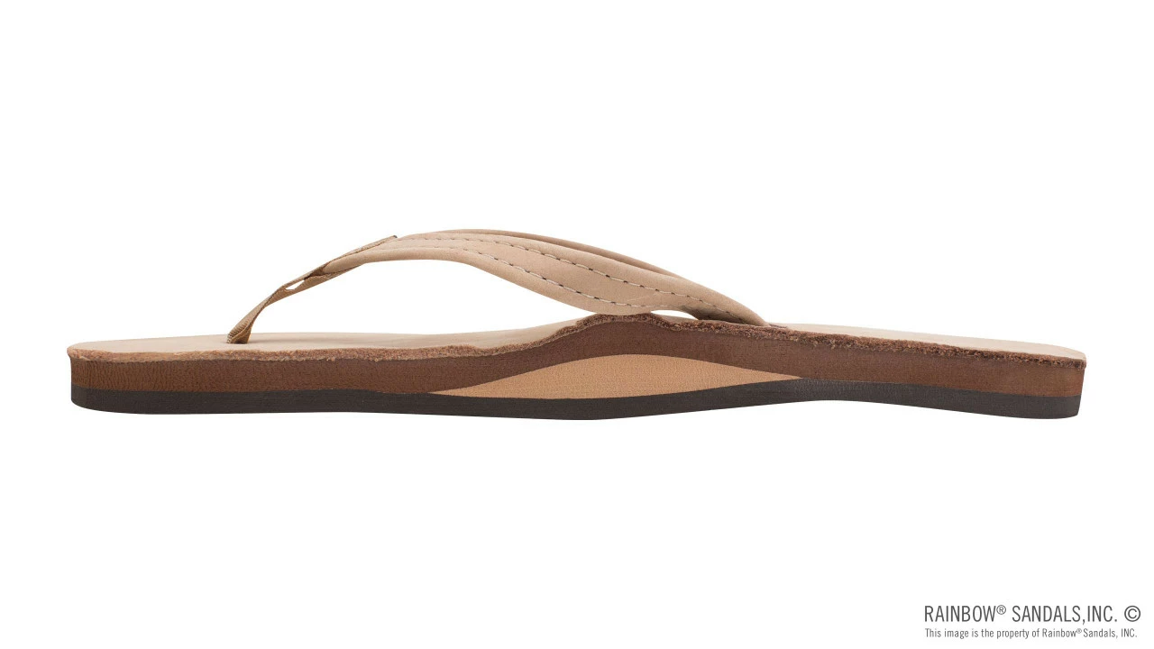 The single layer premier leather sandal is made of top grade nubuck leather; the top sole is embossed with the Rainbowยฎ logo. This model comes with a 1/2″ narrow strap, also nubuck leather; it is double stitched, and the nylon toe piece is secured with a box X stitch, all using bonded nylon thread.