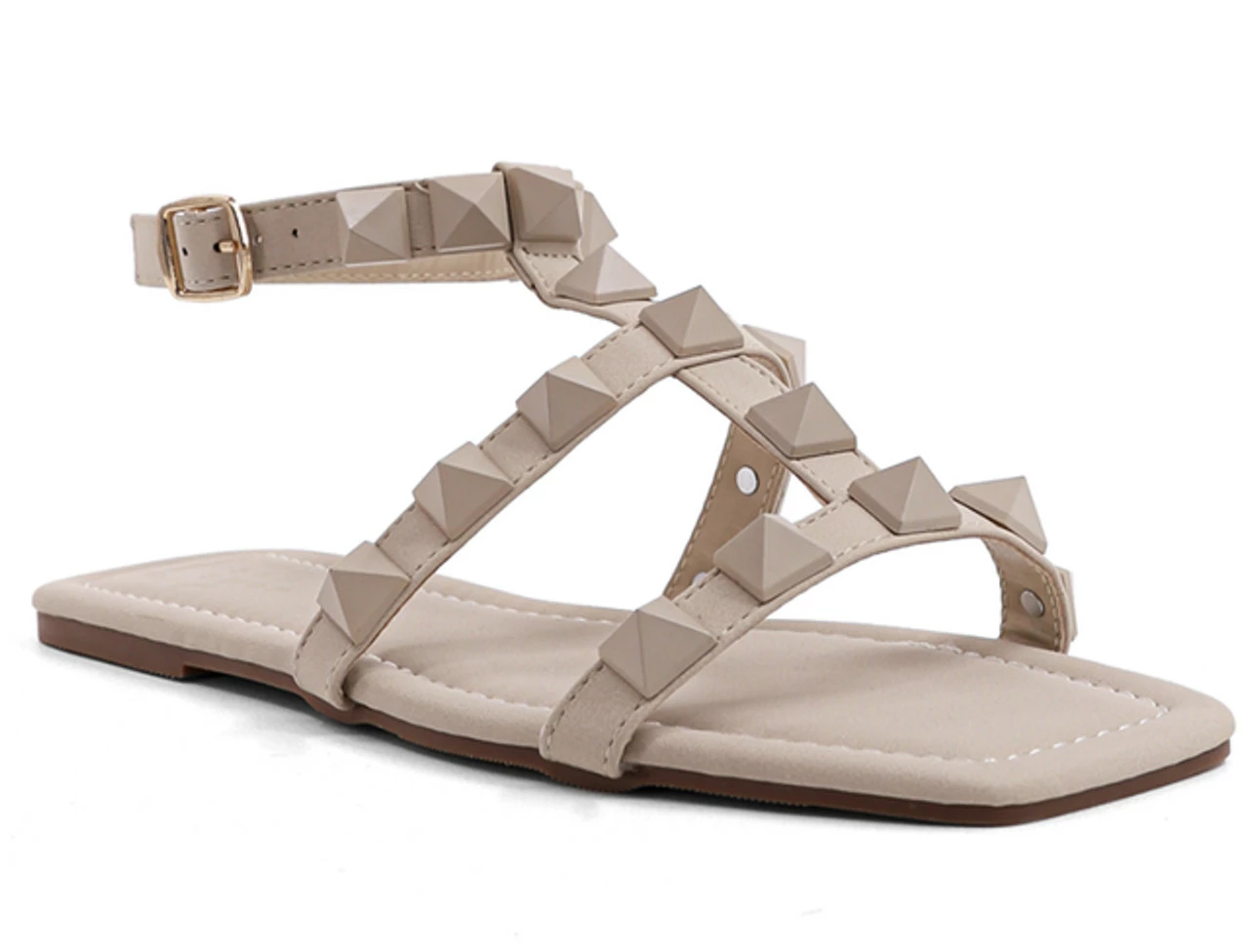 Our BABE studded flat sandal is crafted from supple faux leather and decorated with matching color pyramid-shaped embellishments along the straps. Wear yours with swimwear or denim cut-offs.