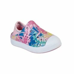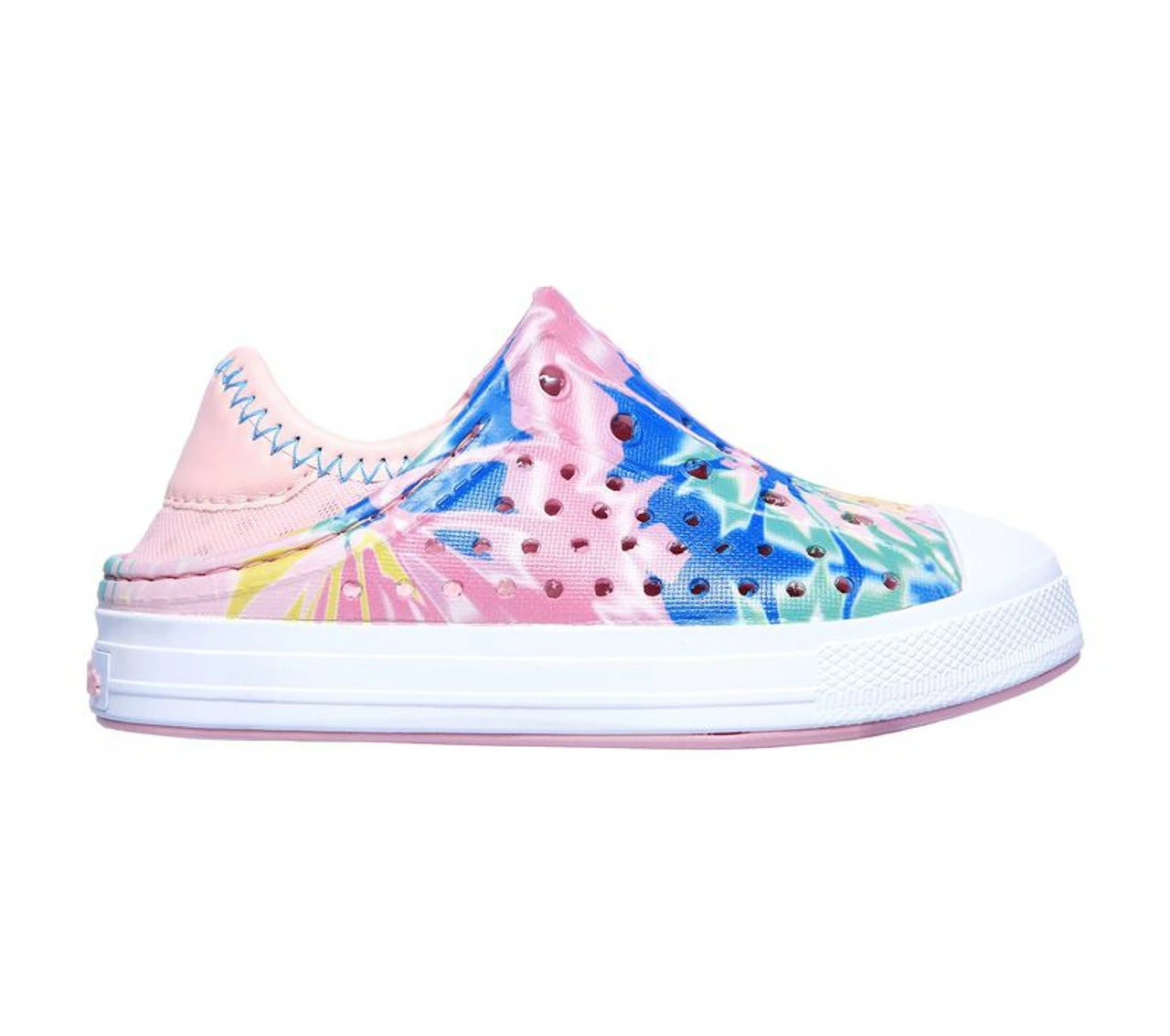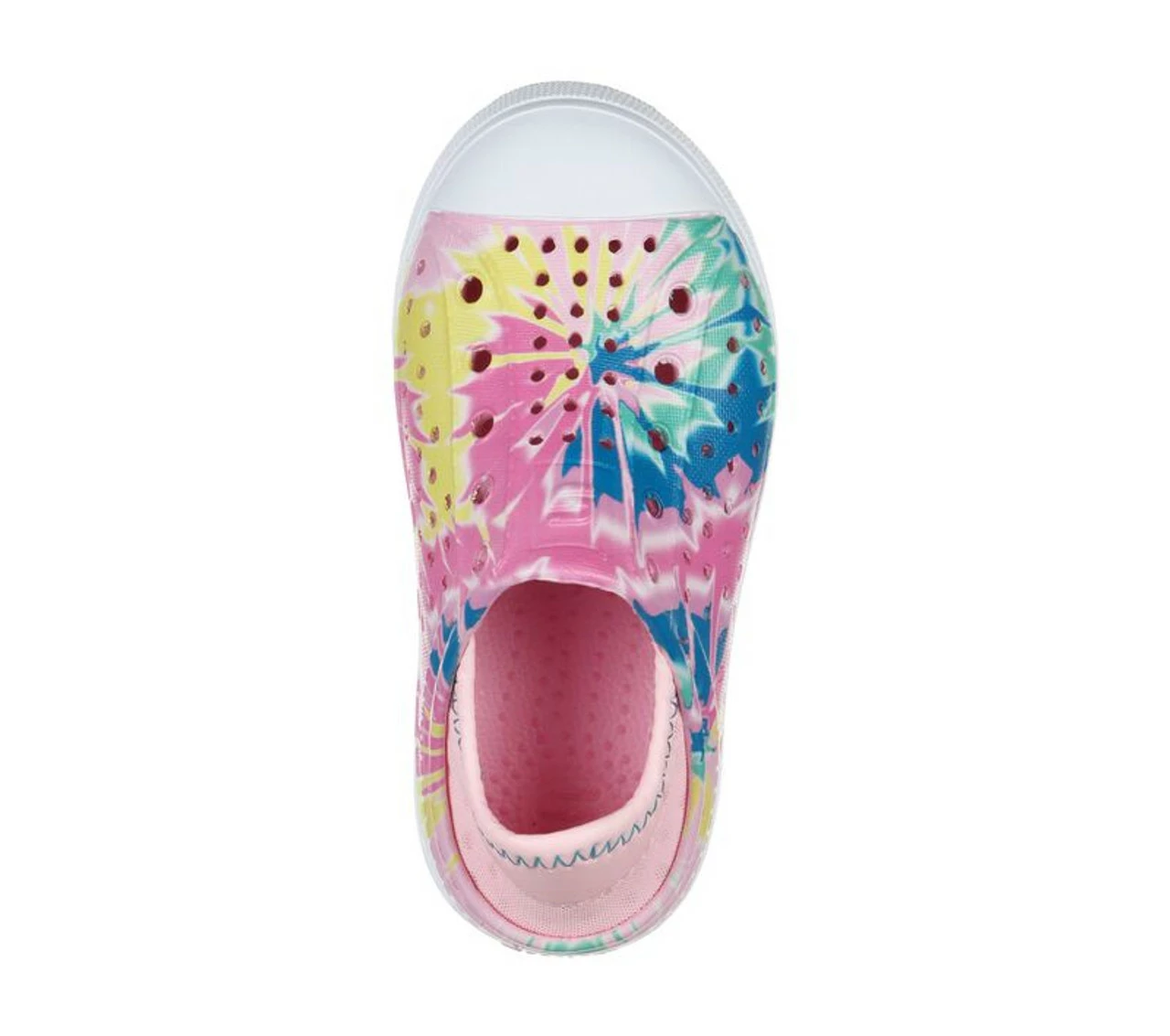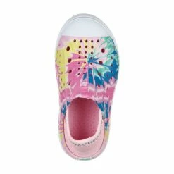Playful groovy style and easy-wearing comfort combine in Skechers Guzman Steps. This tie-dye print slip-on sculpted sneaker features a Foamiesยฎ flexible EVA perforated upper with a cushioned insole and flexible soft neoprene collar for added comfort.