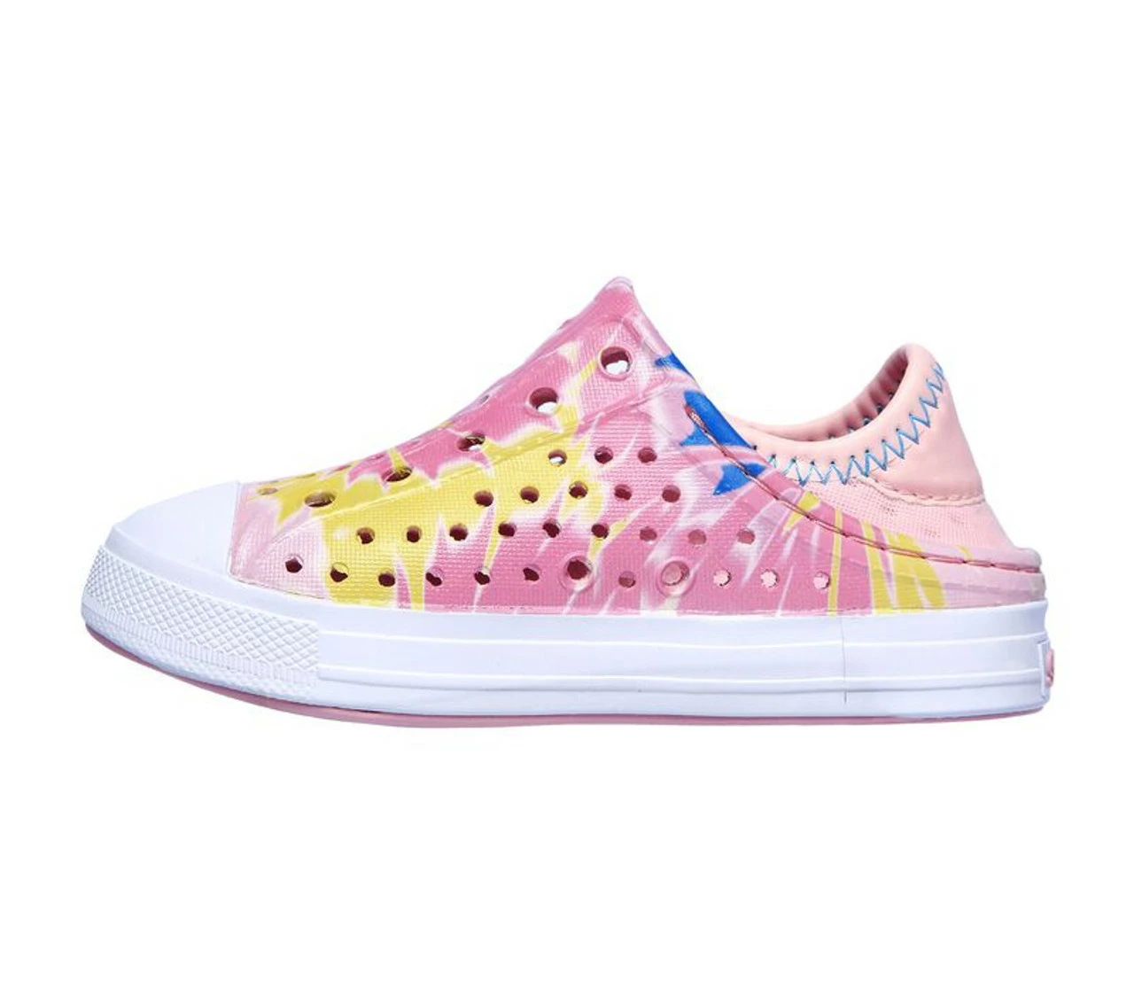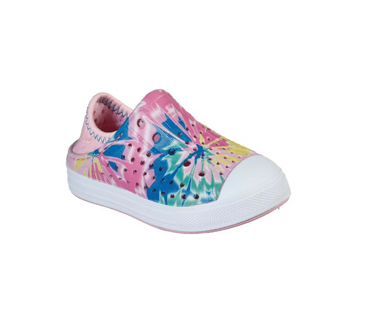Playful groovy style and easy-wearing comfort combine in Skechers Guzman Steps. This tie-dye print slip-on sculpted sneaker features a Foamiesยฎ flexible EVA perforated upper with a cushioned insole and flexible soft neoprene collar for added comfort.